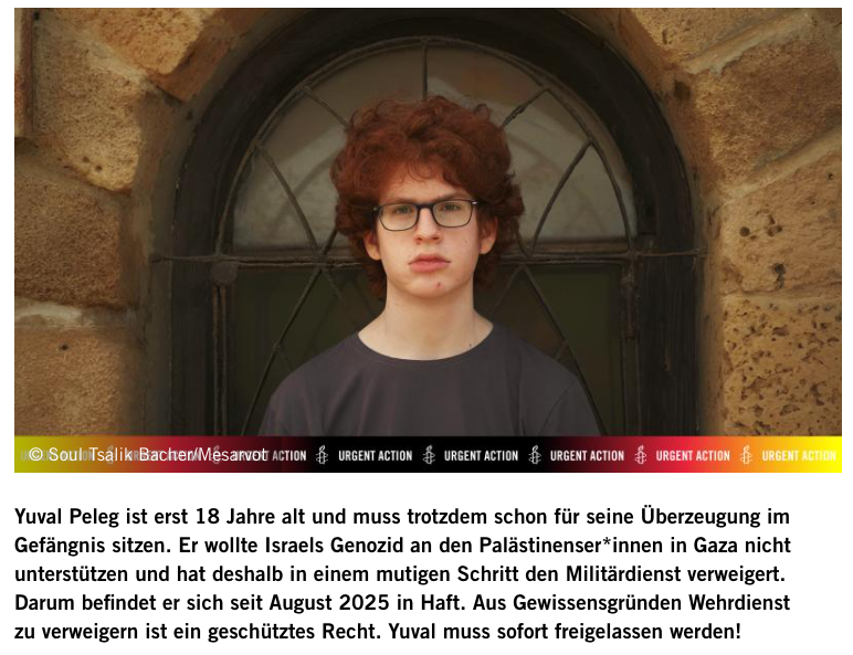 ich habe mich gerade für Yuval Peleg eingesetzt. Der 18-Jährige wollte Israels „Genozid“ (ich spreche zwar lieber von Kriegsverbrechen) an den Palästinenser*innen in Gaza nicht unterstützen und hat deshalb den Militärdienst verweigert. Darum befindet er sich seit August 2025 im Gefängnis. Hier kannst du seine Freilassung fordern:
